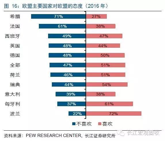 首先,我们考察不同国家对欧盟的态度,发现喜欢欧盟的人数占比有绝对优势的欧盟国家非常少。根据Pew Research Center的调查结果,在2016年,不喜欢欧盟的民众比例超过喜欢的国家有希腊、法国、西班牙和英国,其中,希腊和法国分别有高达71%和61%的民众讨厌欧盟。平均来看,在欧盟所有国家中,有47%的民众讨厌欧盟,而喜欢欧盟的民众比例仅51%,并无显著的领先优势。