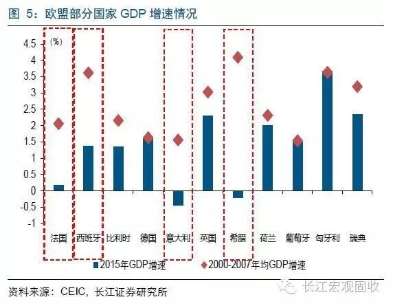 除了政府高负债以外,部分欧盟国家的经济也异常低迷。2015年法国、西班牙、比利时、意大利和希腊的GDP增速均显著低于2000-2007年均值,而2015年西班牙、意大利、希腊、荷兰和葡萄牙的失业率均显著高于2000-2007年均值。高负债、低增长和高失业率并存的现象使得部分欧盟国家经济发展举步维艰。