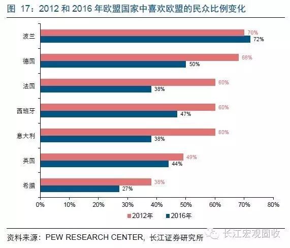 我们再来比较2012年和2016年欧盟主要国家对欧盟的态度变化,会发现最近几年主要国家对欧盟的态度都出现了明显的恶化。根据Pew Research Center的调查结果,在2012年,有68%的德国民众、60%的法国民众、60%的西班牙民众、60%的意大利民众和49%的英国民众喜欢欧盟,而在4年之后的2016年,上述比例分别下降到50%、38%、47%、38%和44%。当然,对于一向对欧盟不感冒的希腊,其国内喜欢欧盟的民众比例已经从2012年的38%跌至当前的27%。