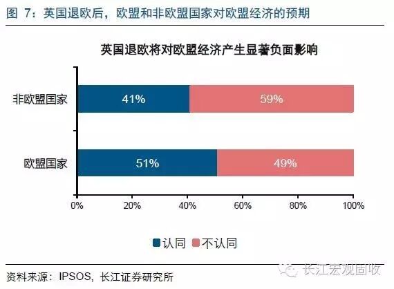 根据IPSOS的调查结果显示,在非欧盟国家(美国、日本和加拿大等国)中,41%的受访者认为英国退欧将对欧盟经济产生显著负面影响,而在欧盟国家中,该比例高达51%;同时,在非欧盟国家中,认为英国退欧将对英国经济产生显著负面影响的民众比例为29%,低于欧盟国家的比例36%。