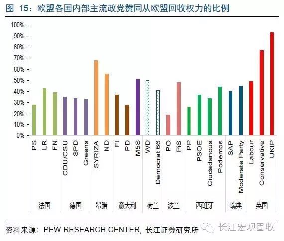 虽然我们无法准确预测欧盟各国未来新的执政党,但我们可以了解欧盟各国主流政党对欧盟的态度。根据美国独立民调机构Pew Research Center的调查结果显示,欧盟所有国家的政党中,平均42%的政党人员希望政府从欧盟回收部分权利,而这要远高于希望政府让渡更多权利给欧盟的比例19%;分国家看,希腊、英国、瑞典、荷兰、德国和匈牙利均有超过40%的政党人员希望政府从欧盟回收部分权利。
