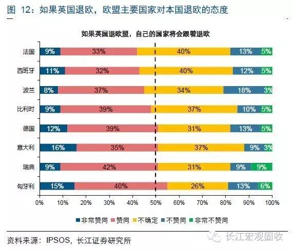 从民调数据来看,“英国退欧公投”结果对其他国家“退欧”意愿的影响非常大。IPSOS的调查结果显示,一旦英国退欧,多数国家支持本国退欧的民众比例都明显提升。比如,民调显示,如果英国退欧,匈牙利将有近55%的民众将支持匈牙利退出欧盟(远高于图11英国未退出欧盟的29%);其他国家方面,瑞典、意大利和德国支持本国退欧的民众比例分别为51%、51%、51%,较英国未退欧情形时的比例分别提高12%、3%和17%,此外,比利时、波兰、西班牙和法国支持本国退欧的民众比例也超过了40%。