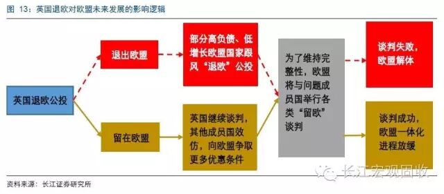 情景1:英国退欧公投结果是“退出欧盟”。那么,部分高负债、低增长的欧盟成员国可能会跟风举办退欧公投,欧盟官方为了保持整个欧盟组织的完整性,将不得不与这些国家进行“留欧”谈判(欧盟与英国在今年2月就曾经就英国留欧条件进行过谈判)。无论谈判结果如何,都将是欧洲一体化的大倒退。即使谈判成功,那些新达成的留欧协议本身也将是牺牲欧盟一体化为代价的。