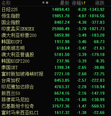 一头升起,一头落下。黄金和美元同时暴涨,通常都是全球金融市场陷入劫难的不祥之兆。最先交易的亚洲市场首当其冲,放眼望去一片哀鸿。截至发稿,日经指数暴跌8.28%,香港恒生指数暴跌4.87%,韩国KOSPI指数大跌3.46%、上证指数下跌1.73%。