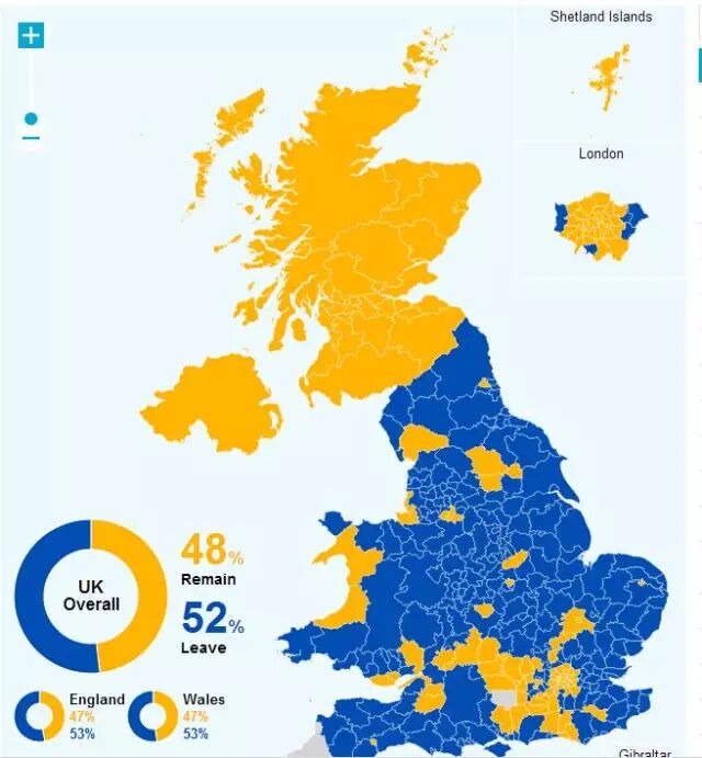 (黄色为支持留在欧洲,蓝色为支持脱离欧洲)