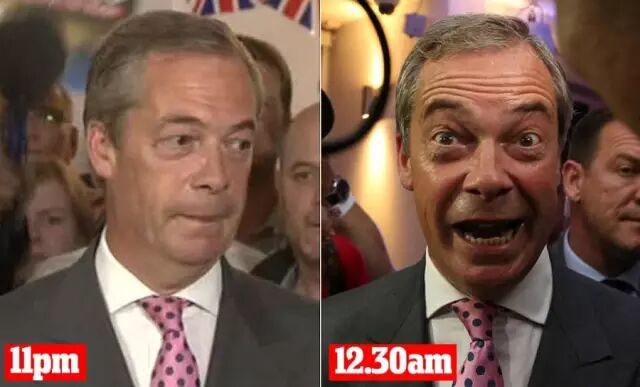 (支持脱欧的独立党主席杰尔·法瑞吉,当地时间晚上11点时因投票结果形式不妙,表情严肃。12点半时,局势反转,欣喜若狂)
