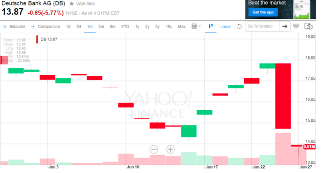 英国退欧的阴影面积仍在扩大,过去两个交易日中,德意志银行股价累计下跌22%,股票成交量暴增,远超近期1000万股的成交。