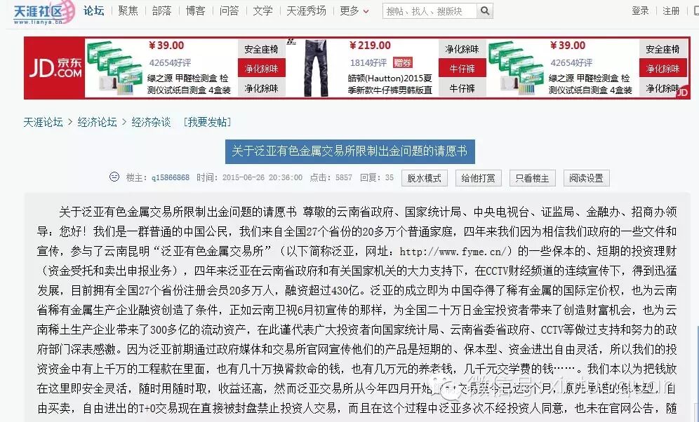 在天涯论坛上,6月26日就有网民发出了“关于泛亚有色金属交易所限制出金问题的请愿书”。