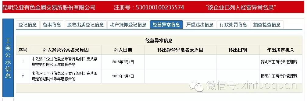 而流动性的好转似乎遥遥无期。记者从全国企业信用信息公示系统上查询到,“昆明泛亚有色金属交易所股份有限公司”在今年7月1日已被昆明是工商行政管理局列入 “经营异常名录”。(图2)