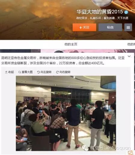 据微博“华夏大地的黄昏2015”爆料:“昆明泛亚有色金属交易所,昨晚被来自全国各地的800多位心急如焚的投资者包围。泛亚交易所资金链断裂,涉及全国20个省份,22万投资者,总金额达400亿元。”