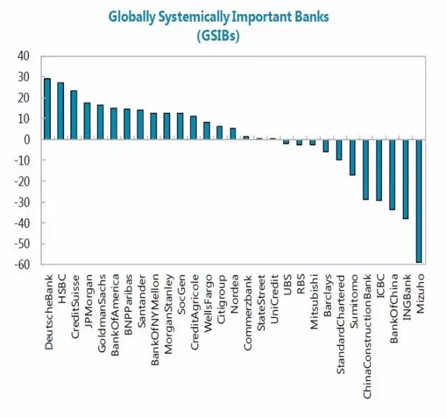 在全球系统性重要银行中,德意志银行是对全球金融系统风险最大的银行,之后是汇丰和瑞信。相反的,在德国国内,德国商业银行对于德国国内金融系统的风险很大,但是对于全球系统性风险的影响有限。总的来说,德国商业银行处在一个接受美国和欧洲的全球系统性重要银行所带来的输入性风险的角色。德意志银行的相对重要性在于进行风险管理,紧密监管全球系统性重要银行和密切追踪其跨境敞口的重要性,同时还有快速提高实行新措施的能力。