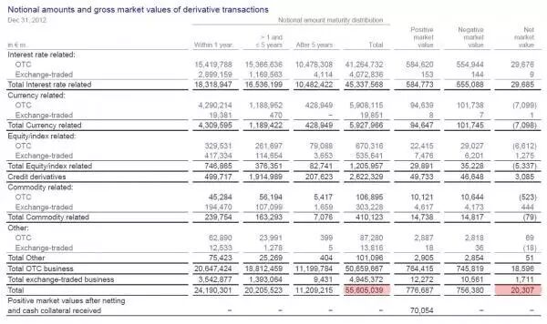 人们可能已经猜到,这一全球衍生品敞口最大的银行不在美国,而是位于欧洲核心的德意志银行。德意志银行的衍生品规模有多大?达到55.6万亿欧元,兑换成美元约为72.8万亿美元。这要比排名第二的摩根大通多出近2万亿美元。