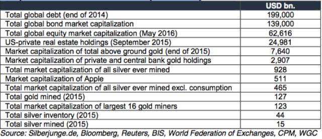 如果将黄金白银的市值与其他资产类别进行对比,可以看到,贵金属价值依然没有别完全体现出来。如图,2015年黄金总开采价值为1270亿美元,史上白银开采总值(排除消费)4650亿美元,苹果总市值5110亿美元,截至2014年全球总债务规模199万亿美元,全球债券市场总值139万亿美元。