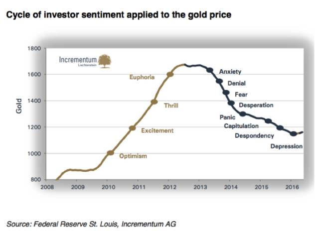 如果将理想化情绪周期与金价走势图进行对比,可以发现,其中最大挫折点最有可能是去年,我们也在去年的黄金报告中提到了“痛苦最大化”。