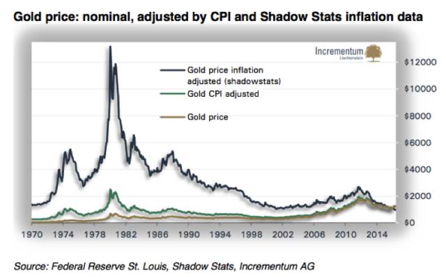 正如现在所看到的,黄金目前的交易价格明显低于通胀调整后的峰值。官方CPI通胀率调整后,1980年金价峰值相当于2481美元(当前汇率)。基于Shadow Stats的调整,当时的金价大约为13177美元。无论是名义价值,还是通货膨胀调整后的价值,金价仍然远远低于峰值。