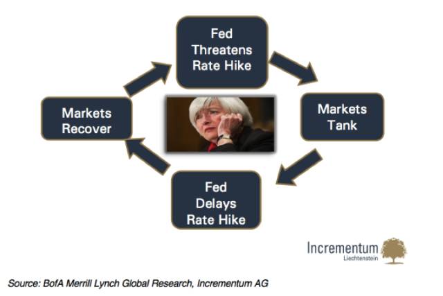 显然,各国央行俨然已经在干预主义的漩涡中绝望地挣扎,也就是说,一旦采用了“非常规货币政策”就似乎不可能摆脱,货币正常化已经变得遥不可及。多数投资者已经基本上从2008年的可怕回忆中走出来。为了获取理想中的收益,他们已经对更大的风险习以为常。