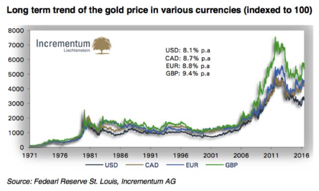 尽管以美元计价的黄金价格目前还未达到高点附近,但数据是很清楚的:自1971年以来,美元计价黄金已经涨了34倍。长期来说,黄金对每个货币都在升值。