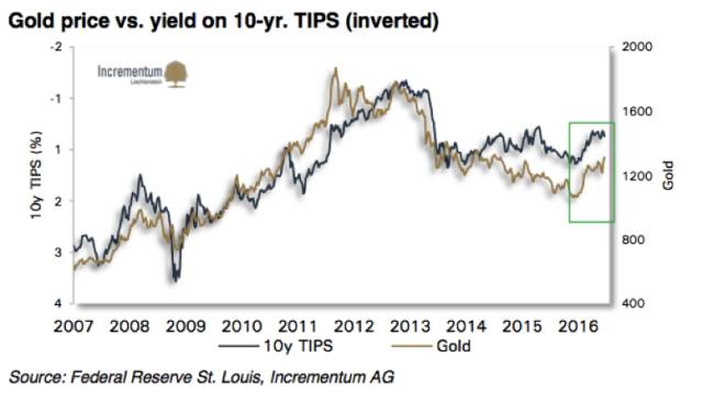 1)负利率降低了持有黄金的机会成本