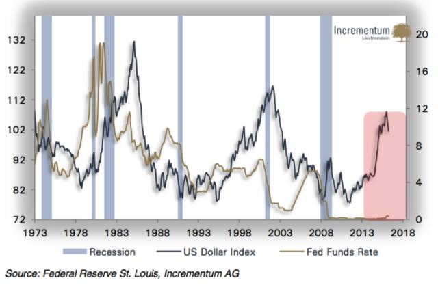 贸易加权美元指数(左)和联邦基金有效利率(右)