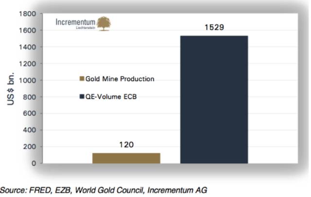 如果欧盟的QE计划继续为Plan1,这相当于(假设黄金价格不变)21609吨黄金的价值,也就是过去几千年内开采的18300吨黄金总量的12%左右。如果加上日本央行QE所释放的资金,2016年QE总量相当于39625吨黄金价值。令人难以置信的是,欧央行和日央行在30天内所印发的货币规模相当于全球全年的黄金产量。