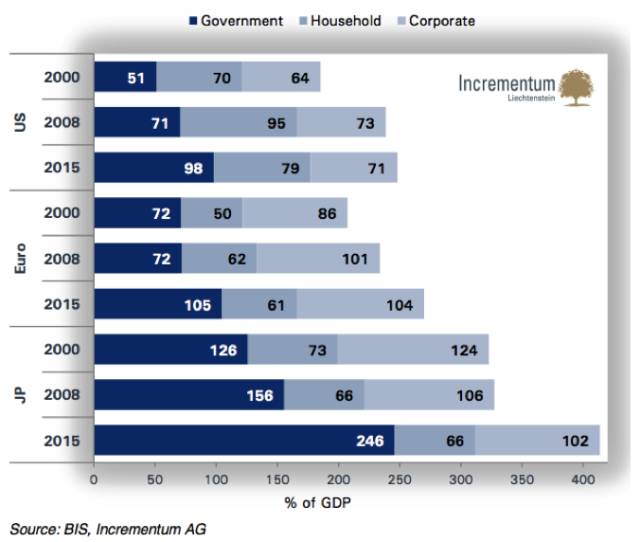私人和公共债务在GDP中的占比(2000/2008/2015)(美国/欧洲/日本)