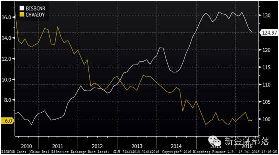 图:人民币实际有效汇率(白)、工业增加值增速(黄)