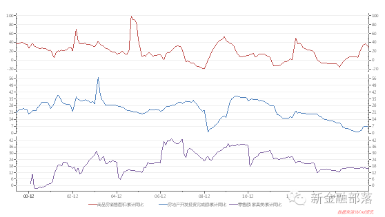 图:商品房销售面积(红)、房地产开发投资(蓝)、家具消费(紫)