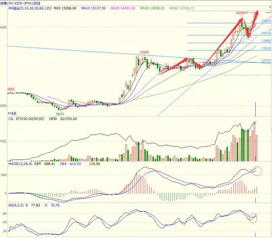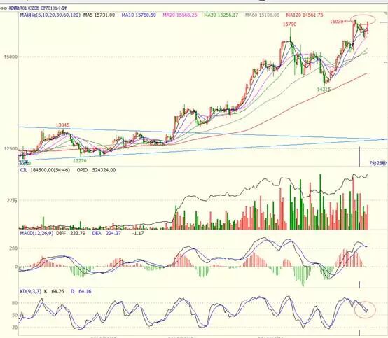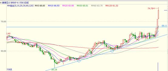 而这两天,美棉也让我们见识了一番,什么叫做老外也疯狂,之前相对理性的美棉,在67以下磨蹭了几个星期,终于在USDA月报发布前一天先拉一根阳线,紧接着,在USDA月报发布之际,一根穿云箭,突破平台阻力68一线,直接涨停,随即昨天在亚洲盘时间都封个涨停板给你看。而随即内盘郑棉在此前上涨的基础上,也再度触及涨停。虽然都重新开板,但强势毋庸置疑。