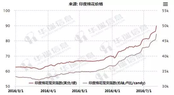 而偏偏这个时候,中国抛储政策改变预期强烈,市场消费状况极度低迷,这样的状况下,棉价出现持续下跌,国外对于中国纱线进口预期也开始缩减,印度开始担心棉纱出口问题,国内棉价低位震荡,加上棉籽价格持续上涨以及卢比的持续贬值,印度棉的国际比价优势明显,周边的巴基斯坦、孟加拉、越南等国家大量进口印度棉,而同期美棉销售的进度处于近五年以来同期最低水平。而随着印度棉的消耗以及美棉价格跌至低位以后的性价比显现,在今年3月以后,印度国内价格开始企稳回升,美棉销售也开始走好,价格反弹。