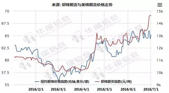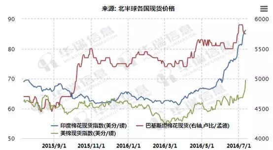 而说到内外盘的关系,先来看一张图,这是北半球各国现货价格走势图,从这张图上其实有很多信息,可以看到,其实这波上涨首先出现涨价的是巴基斯坦,原因也很简单,因为其棉花的受灾带来的大幅度减产,本年度较上年度减产幅度达到40%以上,这样的减产状况下,年度初期,市场的预期就已经非常偏紧了,价格率先开始上涨。