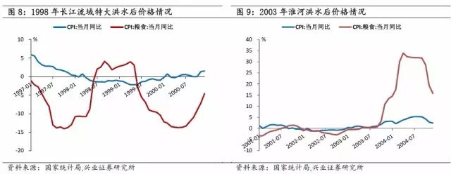 参考1998年、2003年和2010年洪灾发生时期的粮食CPI情况,我们认为洪水对粮食价格是有提振的。1998年特大洪水正处通缩期间,粮价表现明显,2003年淮河洪水过后粮食价格也迅速飙升,2010年长江流域洪水后,粮食价格指数同比增速快于CPI,其中蛋和猪肉涨速较高。