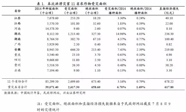 蔬菜:受灾最严重的五个省份蔬菜种植面积占全国25%,蔬菜可能出现短期区域性断供,菜价存在上涨的可能。但蔬菜种植周期较短,洪水退去后视情况可补种,预计恢复速度较快。