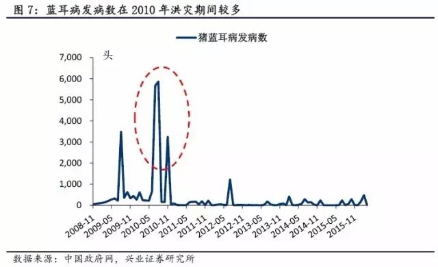 灾害影响二:产品运输受阻,疫病爆发概率提升。(1)两湖是肉猪、禽蛋外销大省,洪水冲垮道路,阻碍运输,导致相关贸易省份供需格局受影响;(2)夏季高温叠加环境潮湿极易诱发动物疫病,污水流动更加速传播,2010年灾后就发生了严重的蓝耳病疫情。