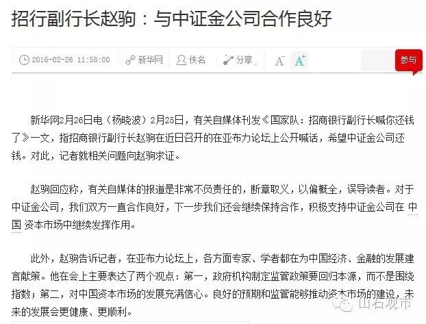 今年2月26日,招商银行副行长赵驹在讨论救市资金问题引发风波后,特地表态,与中证金公司合作良好。