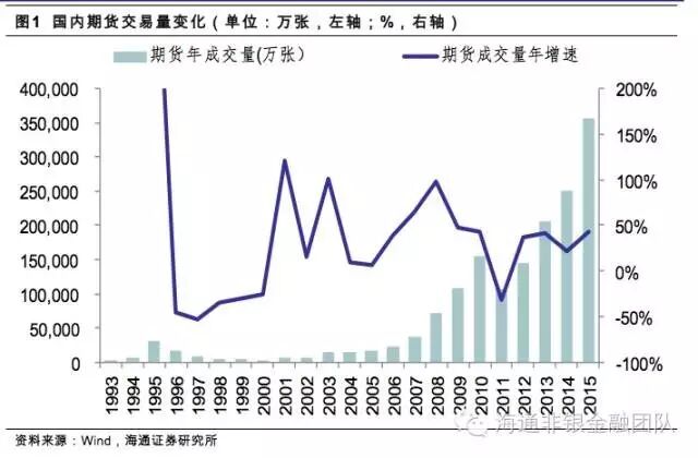 国内期货行业近年发展迅速,2015年国内期货交易量已达到35.78亿张,同比大幅增长42.8%,其中商品期货32.37亿张,同比增长41.4%,金融期货3.4亿张,同比增长57.4%。