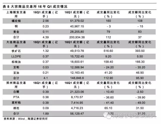 (1)大宗商品热度高涨,期货成交量和成交金额同比快速增长。截止16年1季度,上海期货成交量和成交额同比分别增长112%和37%;大连交易所成交量和成交额同比分别增长112.9%和95.9%。