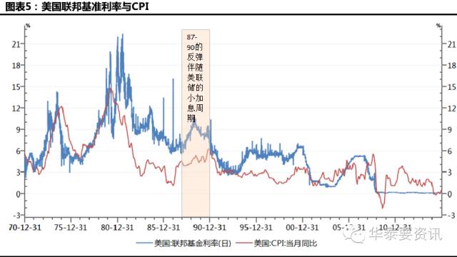 1973-82对应美国的高通胀和货币紧缩周期,87-89年在CPI反弹至3%附近时美联储开启新一轮加息周期.