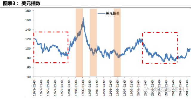 1973-1982年,2002年-2011年,两轮基本金属大牛市都对应了美元指数的单边下行。