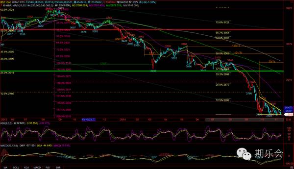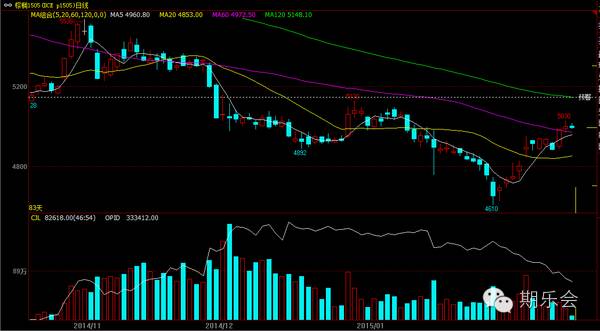 当然,观察持仓量变化,最直观的是看软件给的数据,现在很多操盘软件都可以实时报持仓增减,或者每日盘后,媒体也会报持仓数据,包括各大期货公司的客户持仓增减情况。但我不说这个,只是根据均线系统观察,在理解均线反映的本质后,再想这个问题就会简单些。下面还是以贴图RB1505为例(忽略换月缺口及交割逼仓行为,跳价不影响趋势)。
