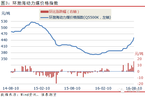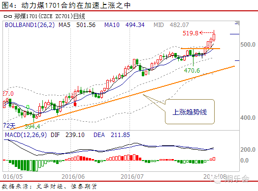 首先,环渤海动力煤价格指数创近两年半时间最大涨幅,正如我们之前所提到的,动力煤现货价格有向期货回归的架势。从图3可以看到,本期环渤海动力煤价格指数上涨16元/吨。现货价格的大幅上涨极大的提振了动力煤期货多头的情绪。而且,动力煤1701合约对应的是1月的现货,而1月又是动力煤的消费旺季。所以,短期来看,动力煤1701合约强势上涨走势有望持续。