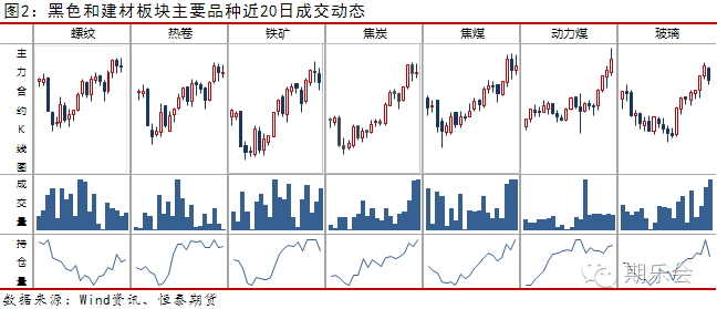 从成交和持仓上看,焦炭、焦煤和动力煤的上涨势头有望持续。从成交量上看,焦煤、焦炭、玻璃、动力煤和铁矿石的成交处于近期高位,螺纹、热卷的成交量相对偏低。从持仓量上看,今日铁矿石、玻璃的持仓量大幅下降,焦煤、焦炭、动力煤的持仓量继续上司,螺纹、热卷的持仓量变动不大。