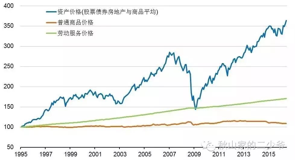 图4:美国个人消费商品价格、服务价格及资产价格(1995年基期=100)