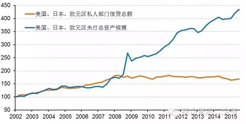 图3:美日欧央行总资产规模与私人部门信贷总额(2002年基期=100)