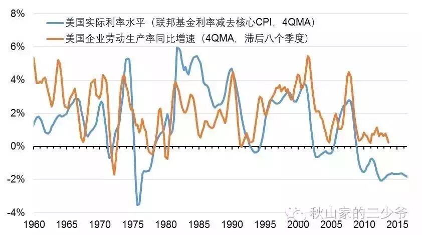 除此以外,美联储对于劳动生产率长期稳定增长的假设也值得商榷。金融危机以后美国劳动生产率的年均增速仅有0.5%,是二战之后历次经济复苏期的最差记录。低迷的劳动生产率增速引起了经济学家对企业盈利和居民生活水准可持续性的广泛担忧,也成为美联储保持货币宽松的重要依据之一。然而,宽松的货币政策究竟是促进劳动生产率的恢复,还是如下图所显示,反而进一步阻碍未来劳动生产率的提高?