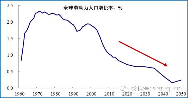 全球增长引擎放缓之二:人口老龄化。我们自2014年年报《无外财而不富》开始提示,全球人口正在步入老龄化,而这将对未来全球的宏观经济层面产生巨大的影响。由于全球老龄化,全球劳动力的增速正在经历快速下降的过程,在未来二十年里劳动力增速可能仅0.5%附近,而在2000-2007年的周期里,劳动力增速平均仍有1.2%。换句话说,单单考虑劳动力的因素,全球潜在增速已下滑0.7个百分点。