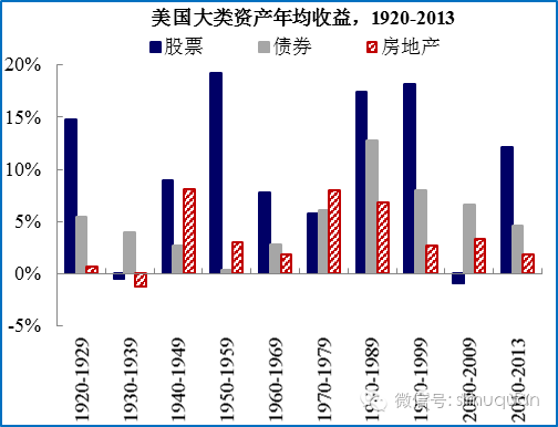 股市>债市>商品、地产。从过去100年的长周期角度来看,大类资产的收益有以下的大致排序:股市>债市>商品、地产。由于数据可得性的问题(Survivor Bias),长周期数据主要限于在过去的一百年中较为“成功”的发达国家。对于这些国家而言,商品仅是投入品,债券仅是获得了经济发展中的无风险收益,而股市享受到经济发展过程中创造附加值带来的超额收益。