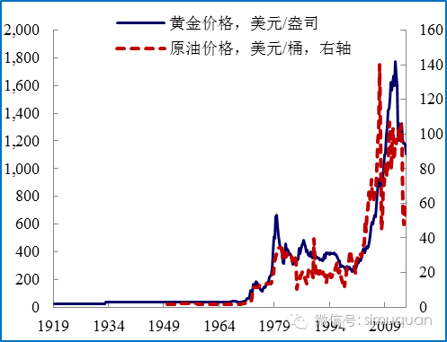 黄金:1)大宗商品上涨带来的通胀风险,如70年代、00年代;2)避险。如2007-2008年的全球性金融危机;