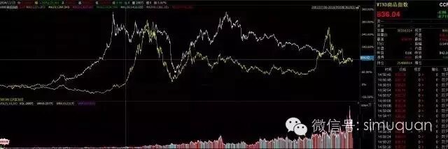 图4.商品期货指数(白色)与上证综指(黄色)的对比