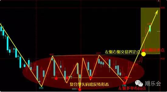 标准二: 在某时间周期框架下,通过技术形态来确认头部或底部完成与否,从而确定左侧交易和右侧交易,即当反转形态确认时,就是左侧交易和右侧交易的界定线。如图: