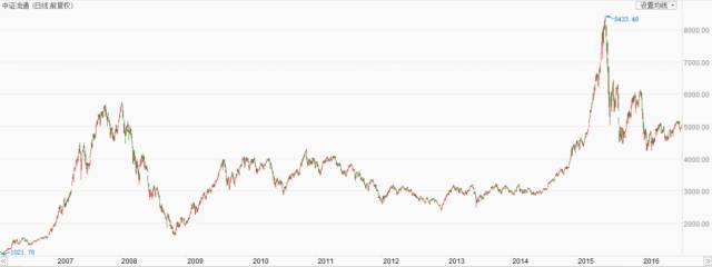 从上图可以很明显的看到,中证流通指数在2015年上半年的大牛市中,居然很轻松的突破了08年创下的高点!!!虽然经历了三次股灾,但目前5000点的点位仍然比06年1000点的点位有了400%的涨幅!与2008年高点基本持平!